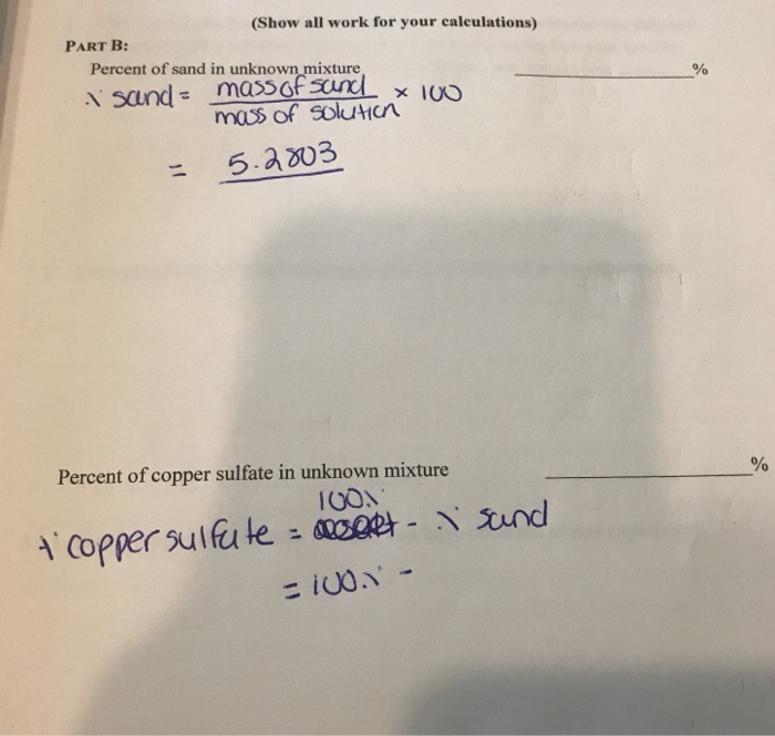 Yes Part A Data 846 Unknown Number Mass of test tube g Mass of unknown sample and test tube 9 1727 2555 Part B Data Mass of filter paper 9 Mass of watch glass g Combined mass of watch glass filter paper and sand 9 02187 302377 351182 Part C Data Total volume of filtrate mL 115 1pts Part A Calculations Mass of unknown sample. To determine the percentage of sand divide the weight of the sand by the weight of the combined salt and sand and multiple by 100. Once we know the mass of each component we can report its percentage.